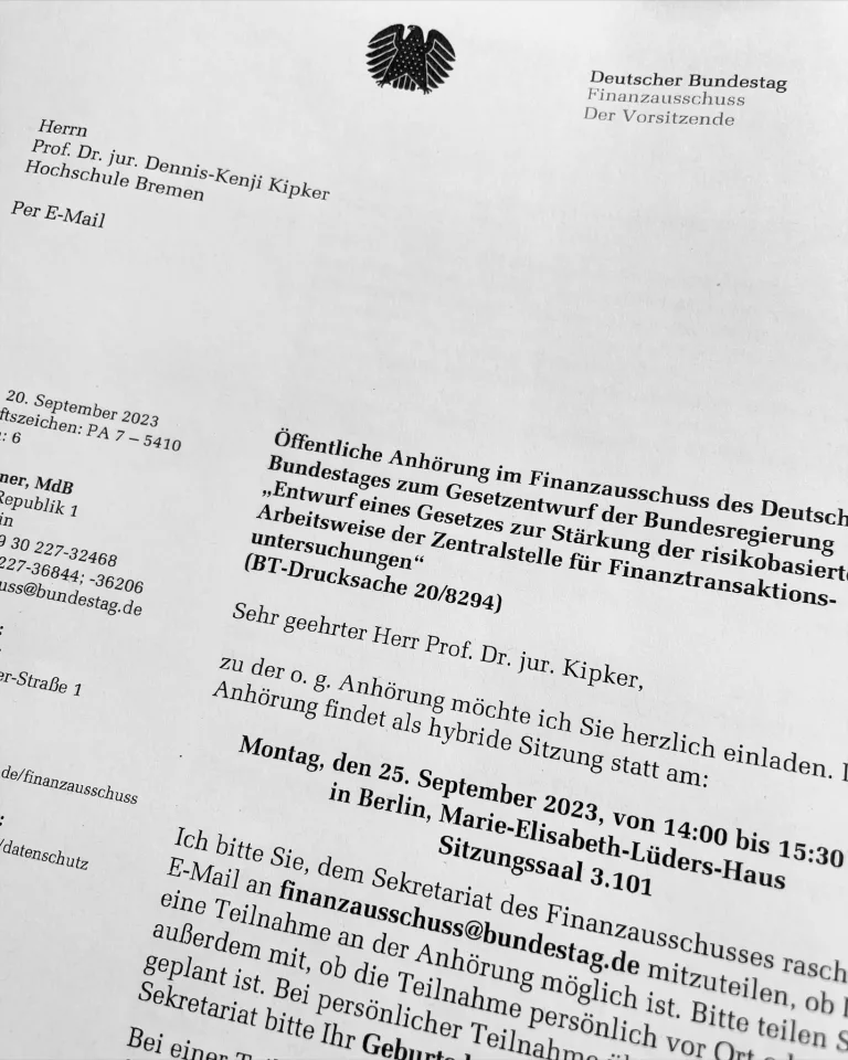 Wie können wir in Deutschland Geldwäsche und das organisierte Verbrechen effektiv bekämpfen – und welche rechtlichen Leitlinien müssen wir dabei beachten? Infolge der Terroranschläge des 11. September 2001 wurde in Deutschland die „Financial Intelligence Unit“ (FIU) als Zentralstelle für Finanztransaktionsuntersuchungen ins Leben gerufen. Ursprünglich beim Bundeskriminalamt angesiedelt, ist sie mittlerweile eine eigenständige Direktion der Generalzolldirektion. In den vergangenen Jahren stand die FIU vermehrt in der Kritik, u.a. weil immer mehr Finanztransaktionen digital abgewickelt werden und das Volumen der Transaktionen die abbildbaren Kapazitäten der FIU übersteigt. Deshalb soll die FIO nun umfassend reformiert werden, um u.a. auch moderne Datenanalysetechniken und AI-gestützte Verfahren zur Datenauswertung einzusetzen. Damit gehen denknotwendigerweise juristische Probleme einher. Zusammen mit dem Bundesbeauftragten für den Datenschutz und die Informationsfreiheit, Prof. Ulrich Kelber, bin ich deshalb zu einer öffentlichen Sitzung des Finanzausschusses des Deutschen Bundestages am kommenden Montag eingeladen, um mich zu diesen Fragestellungen zu äußern. Die Anhörung wird live im Parlamentsfernsehen übertragen.